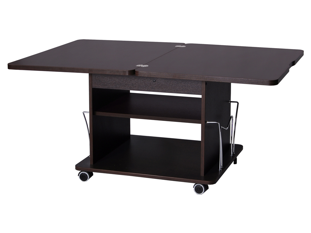 «Агат 14.3» – современный небольшой журнальный стол-трансформер. Поворотный механизм позволяет увеличивать поверхность стола в два раза. На нижней столешнице расположено радиусное углубление, выполняющее роль ручки. Внутри стола расположена полка для хранения скатерти и других полезных мелочей.
