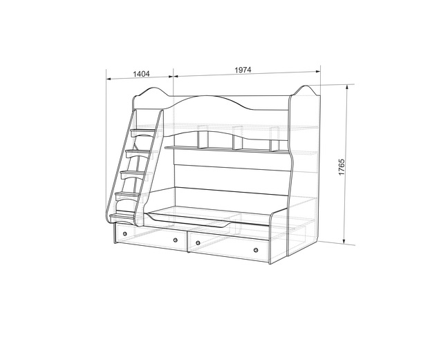Состоит из: 2-х спальных мест, 2-х выдвижных ящиков для игрушек, полок, декоративной шторки, лестницы.