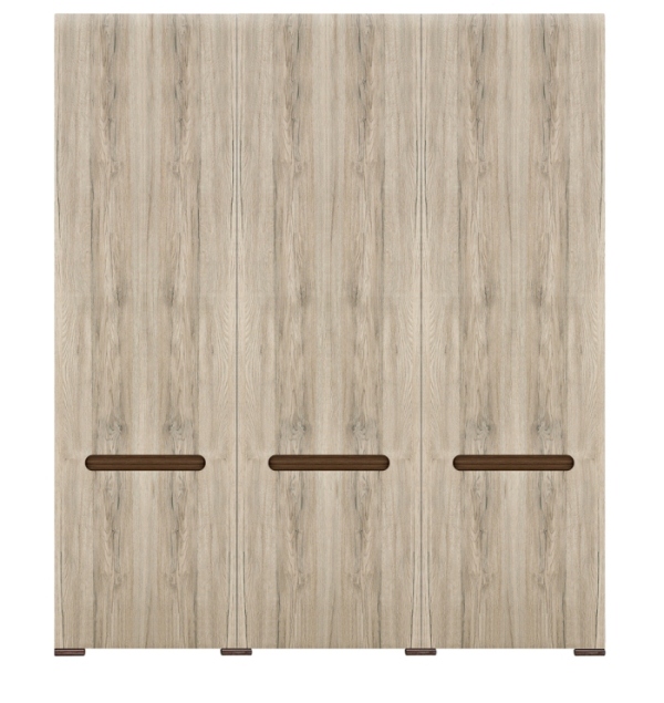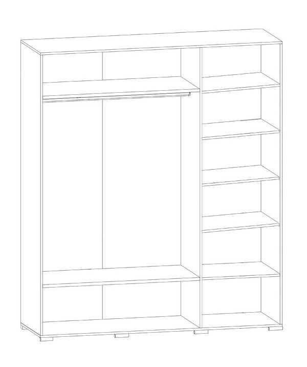 Распашные глухие двери, за левой и средней – в верхней части расположена 1 ниша и штанга стационарная металлическая для одежды, в нижней части расположена 1 ниша, за правой расположены 5 полок;