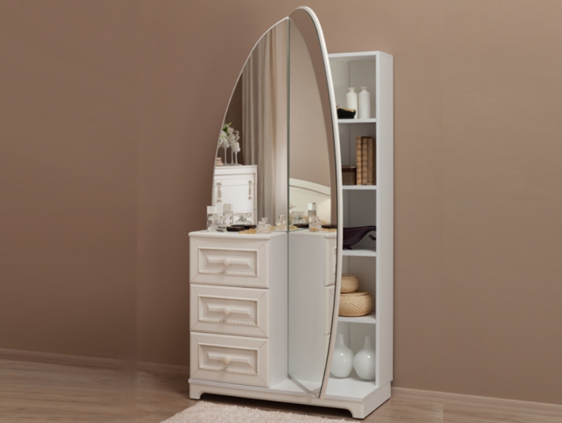 Этот утонченный элемент интерьера украсит собой любую спальню. Совмещает в себе как функционал трюмо, так и вместительного шкафа. Множество скрытых зеркалом полок позволит хранить в нем максимальное количество вещей и аксессуаров. Столешницу из МДФ украшает фрезеровка. На фасады выдвижных ящиков нанесен фрезерованный рисунок. Дверца с зеркалом оснащена доводчиками, благодаря которым дверца закрывается бесшумно.