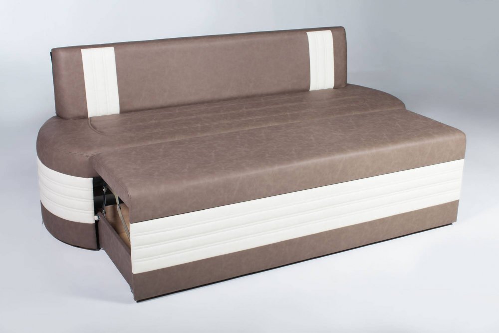 - Модель со спальным местом. Диван имеет механизм трансформации «дельфин», позволяющий получить ровную и оптимальную по площади спальную поверхность. Механизм трансформации весьма прост и требует минимальных усилий: достаточно выкатить из-под сиденья дополнительную платформу (выкатывается по направляющим) и, взявшись за специальные петли, поднять спальное место до уровня сиденья дивана. Тем самым удается получить сплошную и ровную спальную поверхность.