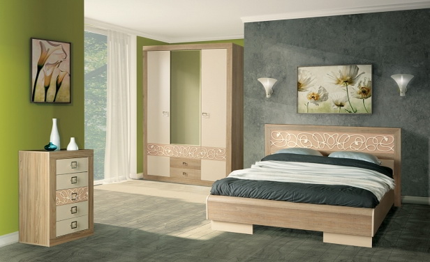 Изюминкой мебели являются флористические рисунки на фасадах и ажурное изголовье кровати.