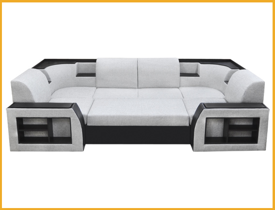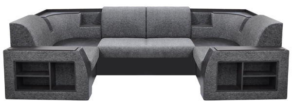 В нише подлокотников, а также в угловом секторе расположены полки из ламинированной ДСП и МДФ. Сидение в угловых секторах состоит из каркаса и двусторонней переворачиваемой крышки (с одной стороны-  МДФ, а с другой мягкое основание из пенополиуретана, обтянутое тканью). Выкатная часть выполняется в основной ткани.