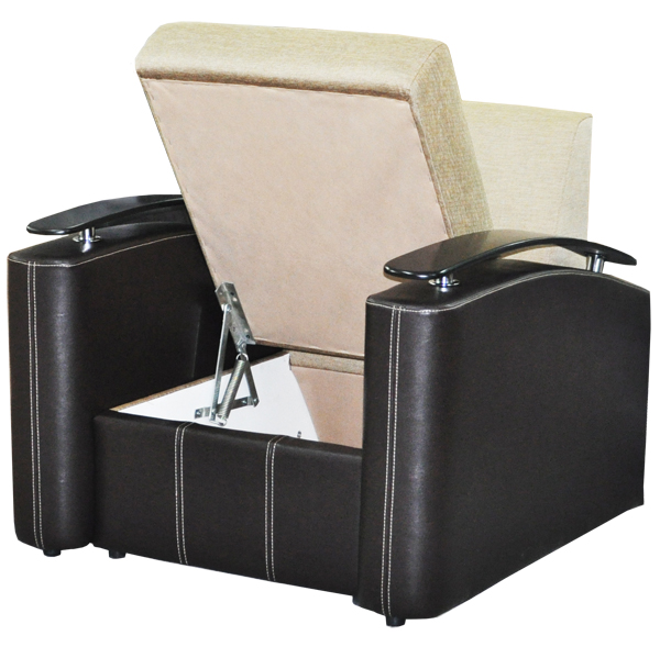 Удобное кресло в современном стиле. В основании сиденья латы и эластичный пенополиуретан. Декоративные накладки на подлокотниках. В основании кресла присутствует емкость для хранения постельных принадлежностей. Подлокотники съемные.