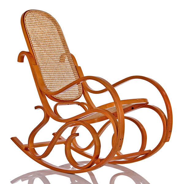 Кресло-качалка с циновочным плетением из ротанга на спинке и сидении.