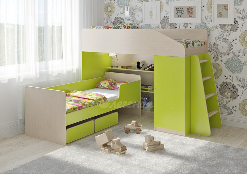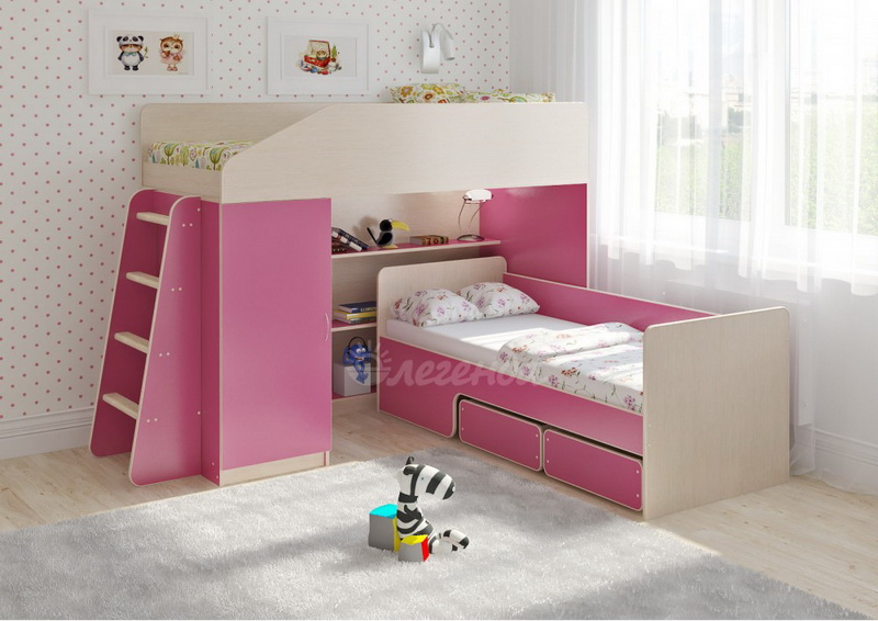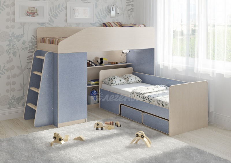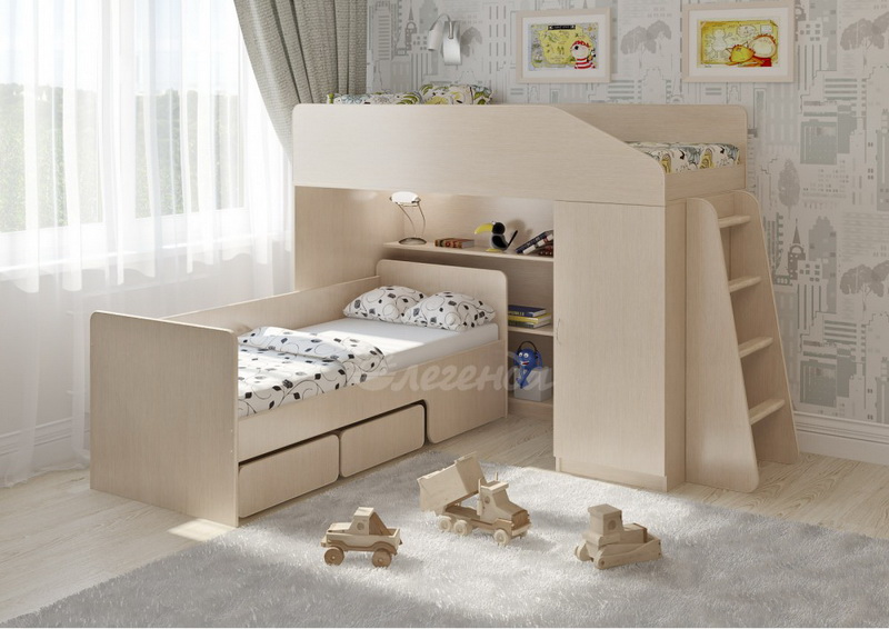 Под верхним спальным местом располагается стеллаж,состоящий из трех полок. Вместительный шкаф с четырьмя полками и штангой для хранения одежды,белья,игрушек или иных вещей.