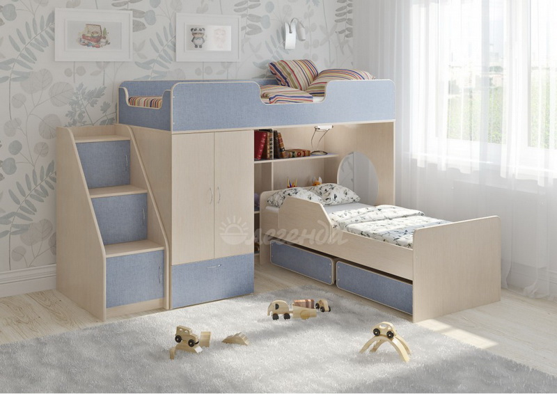 Под верхним спальным местом располагается стеллаж,отлично подходящий для хранения игрушек.Стеллаж состоит из трех полок,разделенных на две секции – удобно для поддержания порядка и сортировки предметов.