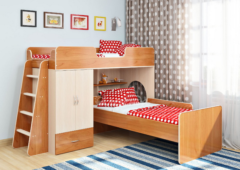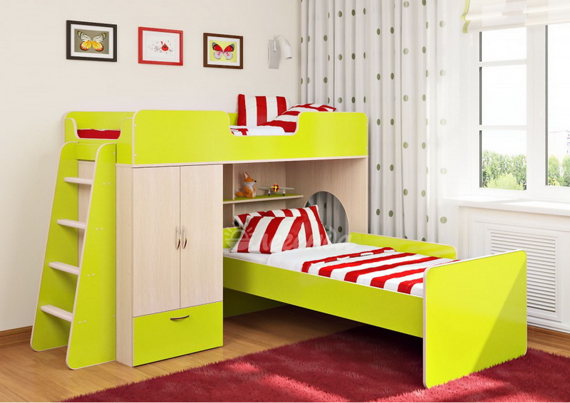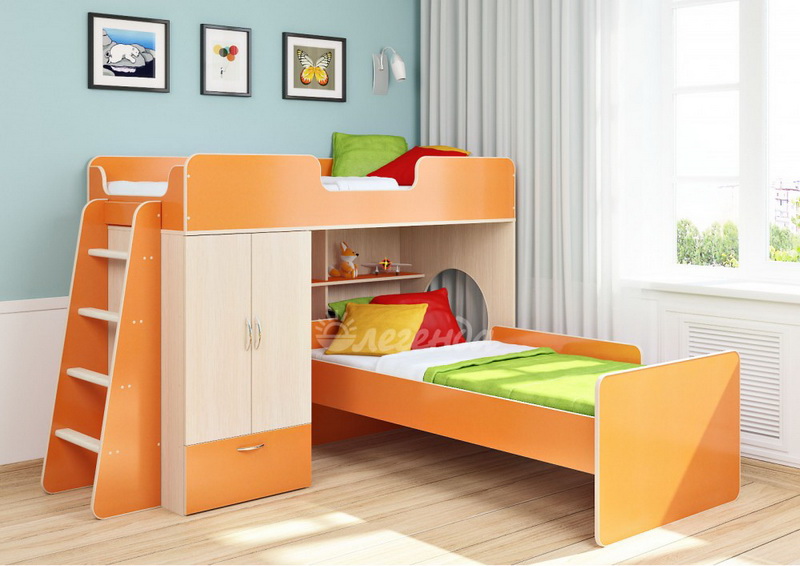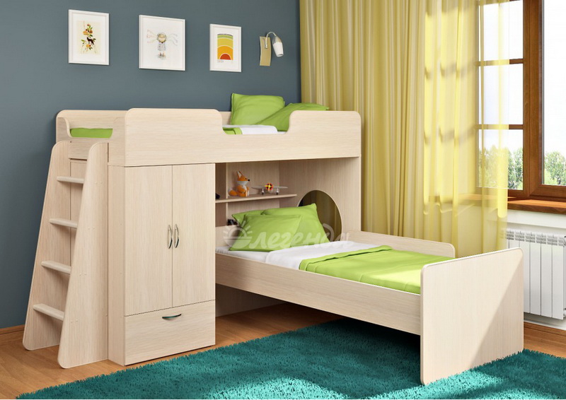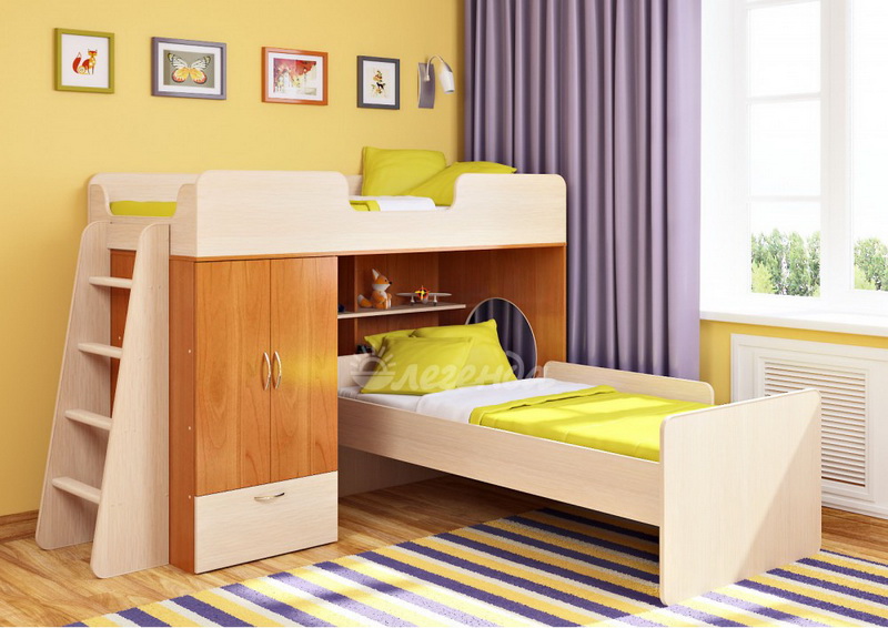 Под верхним спальным местом в игровой зоне располагается стеллаж,отлично подходящий для хранения игрушек.