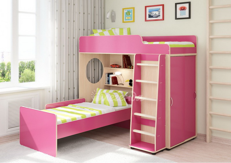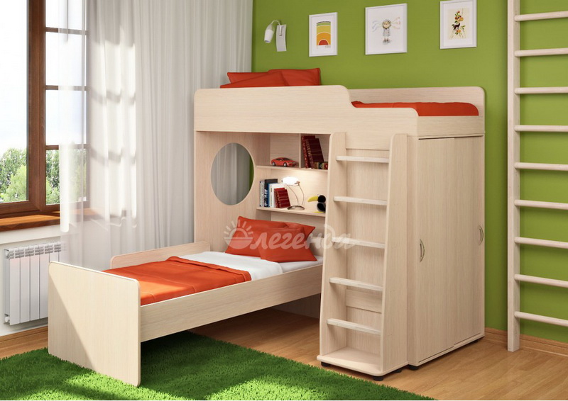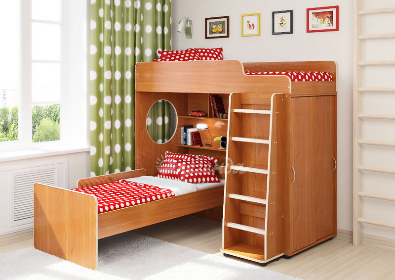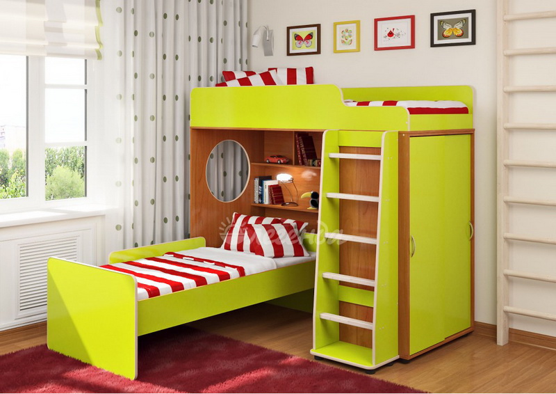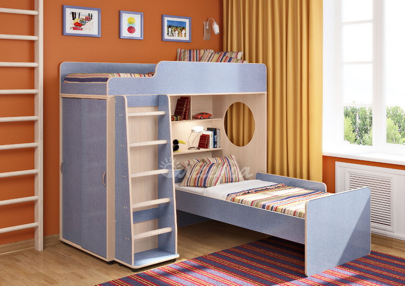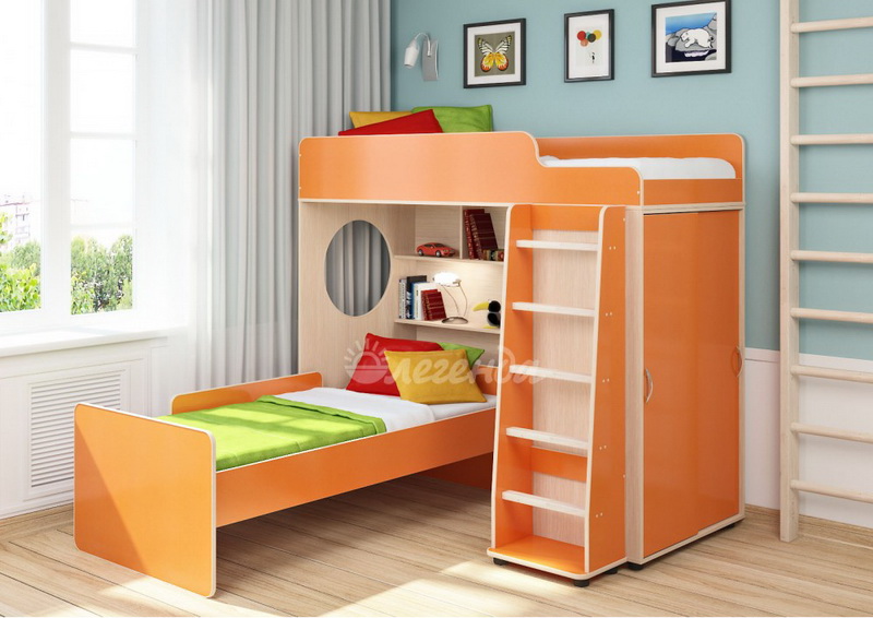Под верхним спальным местом в игровой зоне располагается стеллаж,отлично подходящий для хранения игрушек.Стеллаж состоит из трех полок, разделенных на две секции – удобно для поддержания порядка и сортировки предметов.