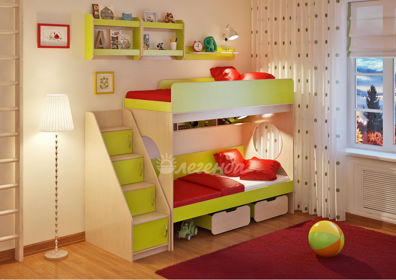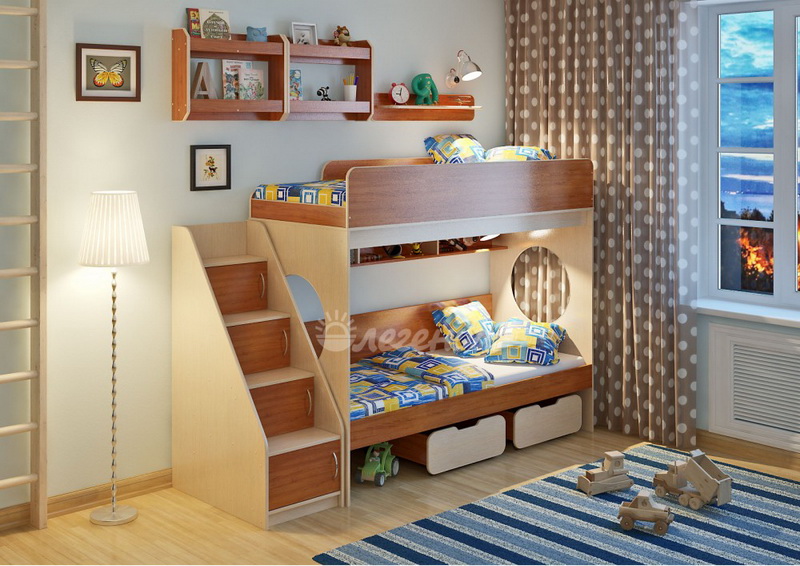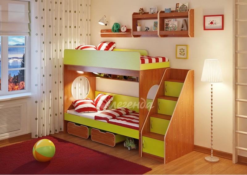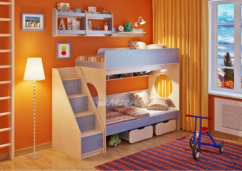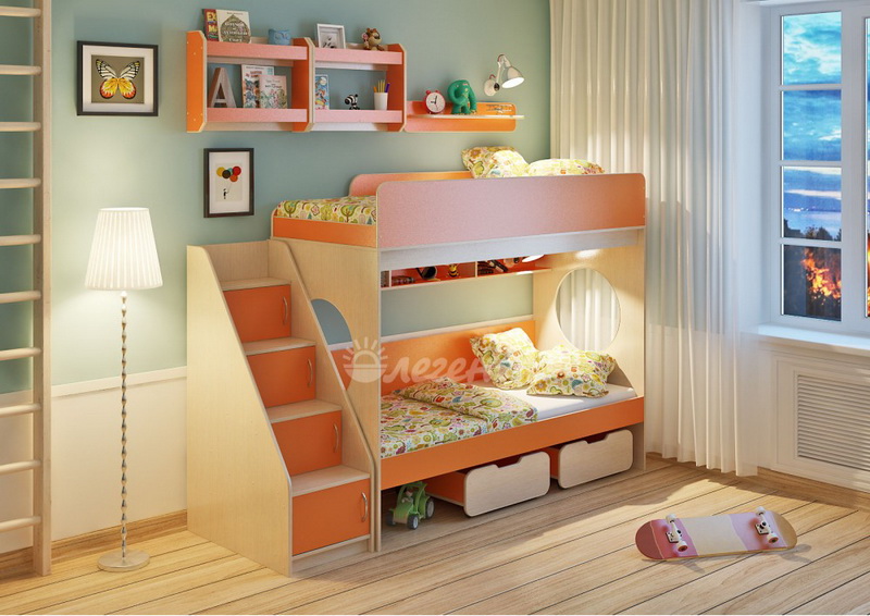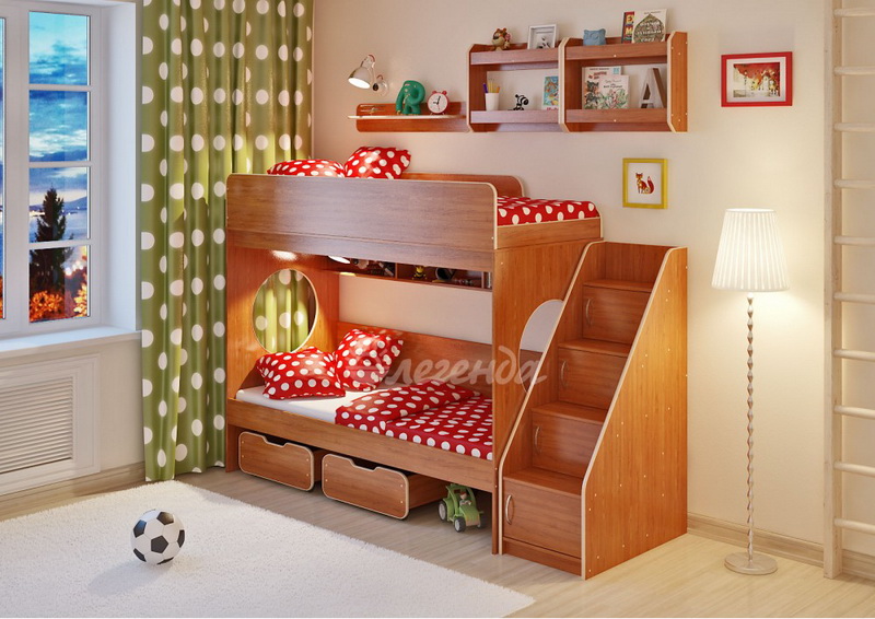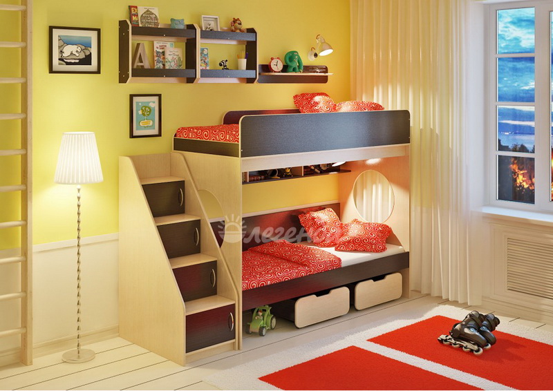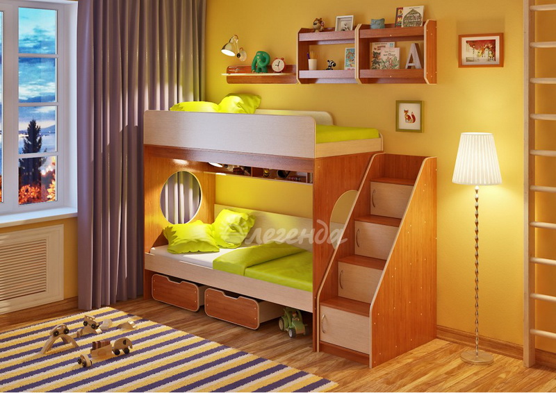 Над нижним спальным местом располагается встроенная трёхсекционная полка,в которой удобно хранить книги,учебники,тетради,канцелярию и другие нужные вещи.