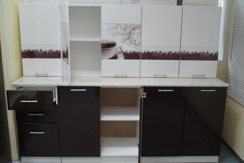 Комплектация 2,0 м: низ - стол под мойку на 80 см (без столешницы), стол рабочий на 80 см (со столешницей), стол с 3 мя ящиками на 40 см (со столешницей) верх - шкаф под посудосушитель на 80 см, шкаф распашной на 80 см, шкаф распашной на 40 см