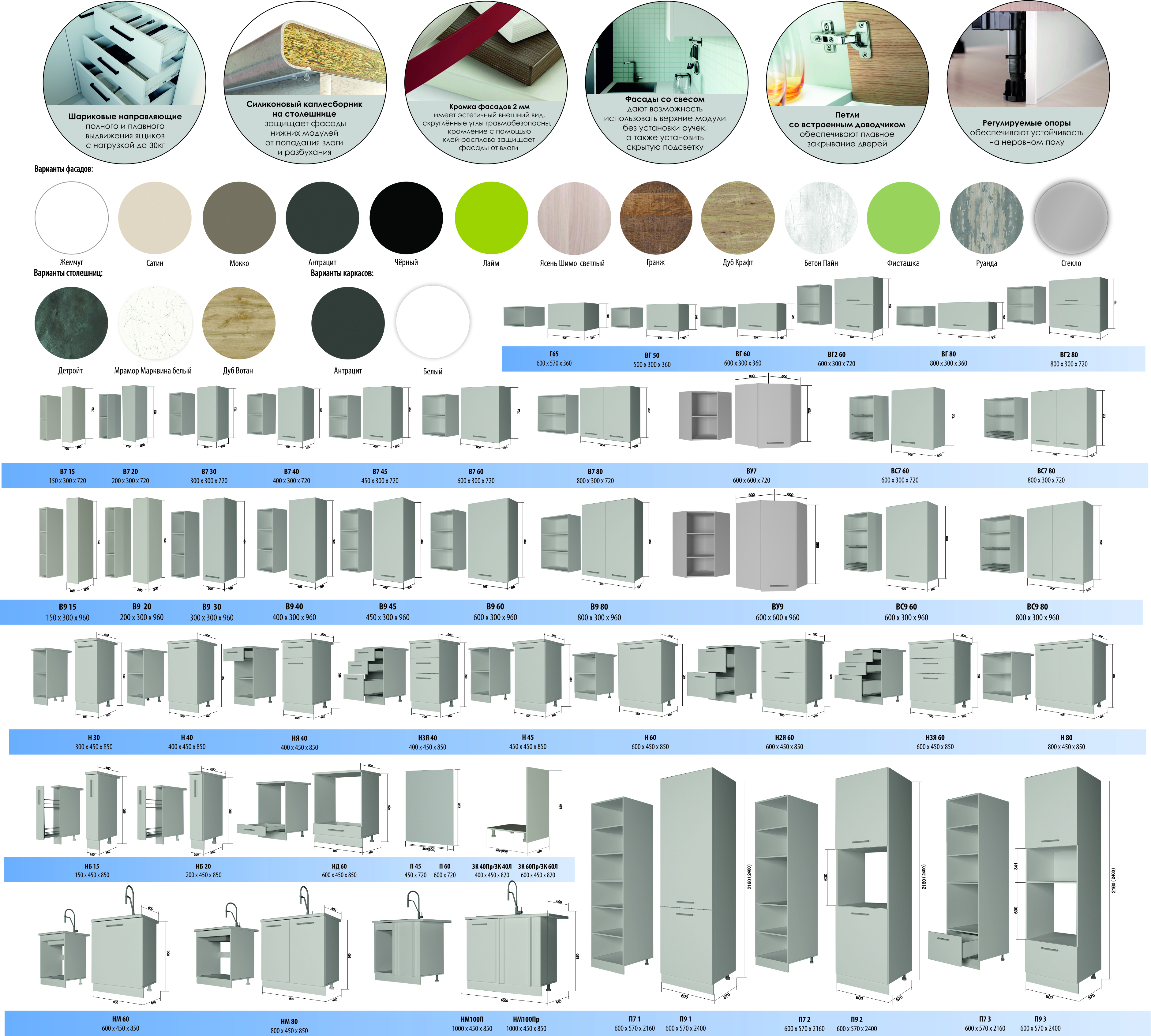 Срок изготовления кухни 7 рабочих дней. Кухню можно менять по комплектации, дополнять, удалять модули, менять цвет фасадов, корпуса и столешницы.
