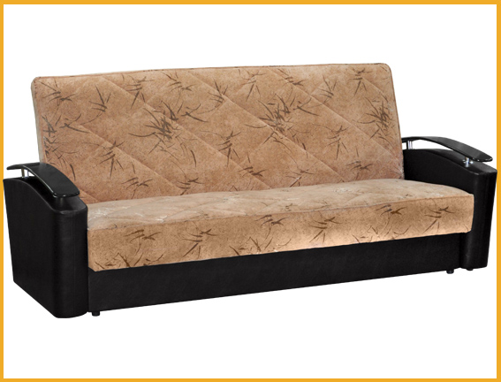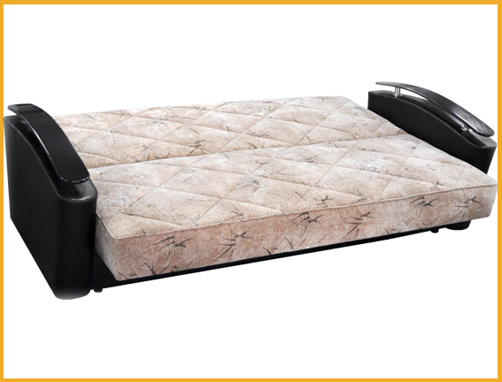 Современный стиль. Ровное спальное место. Боковины дугообразной формы, при помощи хромированных элементов на них установлены декоративные подлокотники. При трансформации дивана требуется расстояние между стеной и диваном. В основании короба имеется емкость для хранения спальных принадлежностей. Сиденье и спинка сформированы на основе деревянных рамок и на основе пружинных блоков соединены между собой настилом из эластичного листового пенополиуретана и соединенных между собой механизмом трансформации «книжка».