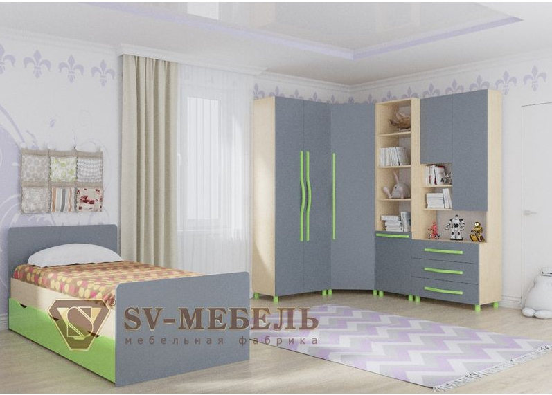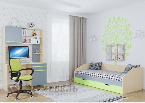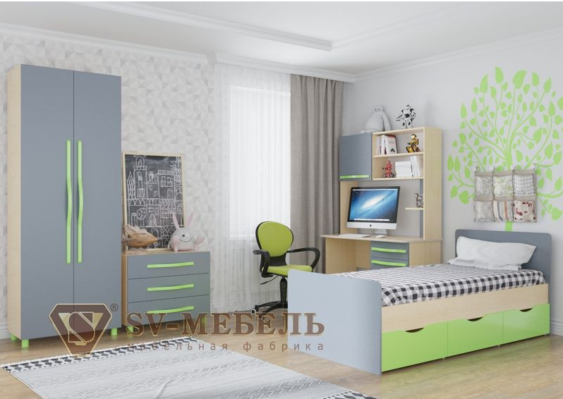 Детская серия "Алекс 1" - идеальное решение для детской комнаты, созданная больше для подростков. Выполнена в необычных тонах.  Это очень стильная и современная модель. Ручки выполнены в цвете Лайм, что прекрасно сочетается с цветом фасадов: Титан.