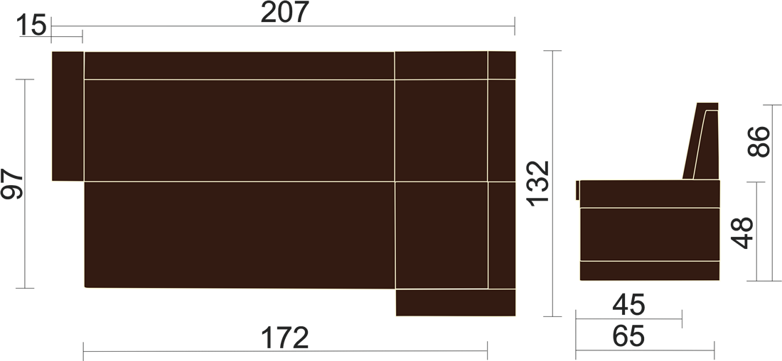 - Модель со спальным местом. Диван имеет механизм трансформации «дельфин», позволяющий получить ровную и оптимальную по площади спальную поверхность. Механизм трансформации весьма прост и требует минимальных усилий: достаточно выкатить из-под сиденья дополнительную платформу (выкатывается по направляющим) и, взявшись за специальные петли, поднять спальное место до уровня сиденья дивана. Тем самым удается получить сплошную и ровную спальную поверхность.