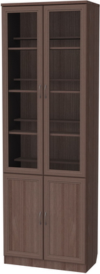 Этот компактный шкаф прекрасно подойдет для размещения в малых по площади комнатах. Благодаря хорошей планировке, несмотря на небольшие размеры, шкаф действительно вместителен, в нем можно будет хранить довольно большое количество книг. Шкаф разделен на два отдельных сектора, верхний сектор порадует четырьмя полочками за стеклянной дверью. Нижнее отделение закрыто сплошными деревянными дверцами.