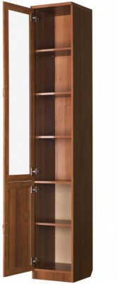 Шкаф разделен на две части. Верхняя часть спроектирована с застекленной дверцей и четырьмя полочками. Полочки одинаковые по размеру и находятся на равном расстоянии одна от одной. Расположены они таким образом, чтобы в шкафу было удобно хранить не только обычного формата книги, но и большие по размерам печатные издания или папки с документами (что очень удобно, если шкаф приобретается для использования в офисе). Благодаря внушительному объему, на полочках можно хранить большое количество книг.