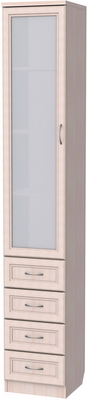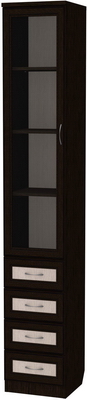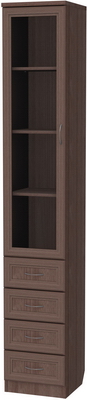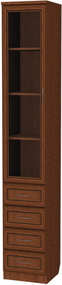 Шкаф разделен на два отделения. Верхнее отделение предназначено для хранения книг. В нем, за стеклянной дверью расположены четыре полочки. Полки обладают одинаковым размером и крепятся они на равном расстоянии одна от одной. Большим преимуществом является то, что смоделированы полочки таким образом, чтобы на них можно было выставлять книги любых форматов, даже самые большие, наподобие энциклопедий, справочников, словарей, атласов.