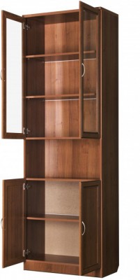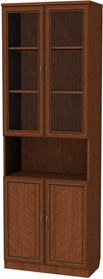 Визуально шкаф разделен на две части: верхнюю и нижнюю, между которыми находится дополнительная полочка. Верхняя часть спроектирована с четырьмя полками, которые абсолютно одинаковы как площадью, так и по расстоянию. Полочки закрыты стеклянной дверью. В зависимости от ваших желаний, вы сможете заказать шкаф, в котором стандартные деревянные полки будут заменены на стеклянные, а задняя деревянная стенка – на зеркальную. Полочки обладают достаточно большой площадью, благодаря чему на них можно разместить довольно много книг, причем с легкостью можно поместить книги любого формата, от самых маленьких до самых больших по размерам изданий.