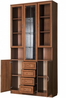 Визуально шкаф разделен на две части: верхнюю и нижнюю. Верхняя часть, в свою очередь, тоже разделена на три части. По центру находится большое отделение с четырьмя полочками, особенность полочек заключается в том, что выполнены они из стекла и дополнены зеркальной задней стенкой. Очень красиво будут смотреться расположенные тут, к примеру, хрустальные сервизы. По бокам, от центрального отделения, расположены еще два дополнительные. Они укомплектованы тремя деревянными полочками, одинакового размера и равноудаленными одна от другой. Там более удобно будет хранить посуду для повседневных нужд. Под ними расположены дополнительные, полностью открытые полочки, предназначенные для хранения разнообразных сувенирчиков, статуэток, фотографий и прочих, «радующих глаз», вещиц. Все двери выполнены из древесины и стекла.