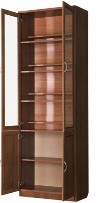 Этот компактный шкаф прекрасно подойдет для размещения в малых по площади комнатах. Благодаря хорошей планировке, несмотря на небольшие размеры, шкаф действительно вместителен, в нем можно будет хранить довольно большое количество книг. Шкаф разделен на два отдельных сектора, верхний сектор порадует четырьмя полочками за стеклянной дверью. Нижнее отделение закрыто сплошными деревянными дверцами.