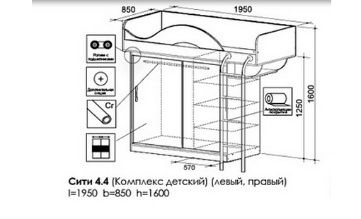 Размеры (ШхГхВ): 1950х850х1600 мм, спальное место 800х1900 см. Под спальным местом расположен шкаф-купе. Внутреннее пространство шкафа разделено на два отделения со штангой и полками. Лестница в комплекте.
