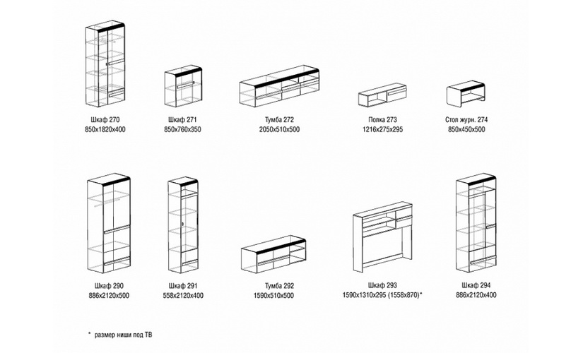 Размер ниши под ТВ - 1558х870 мм.