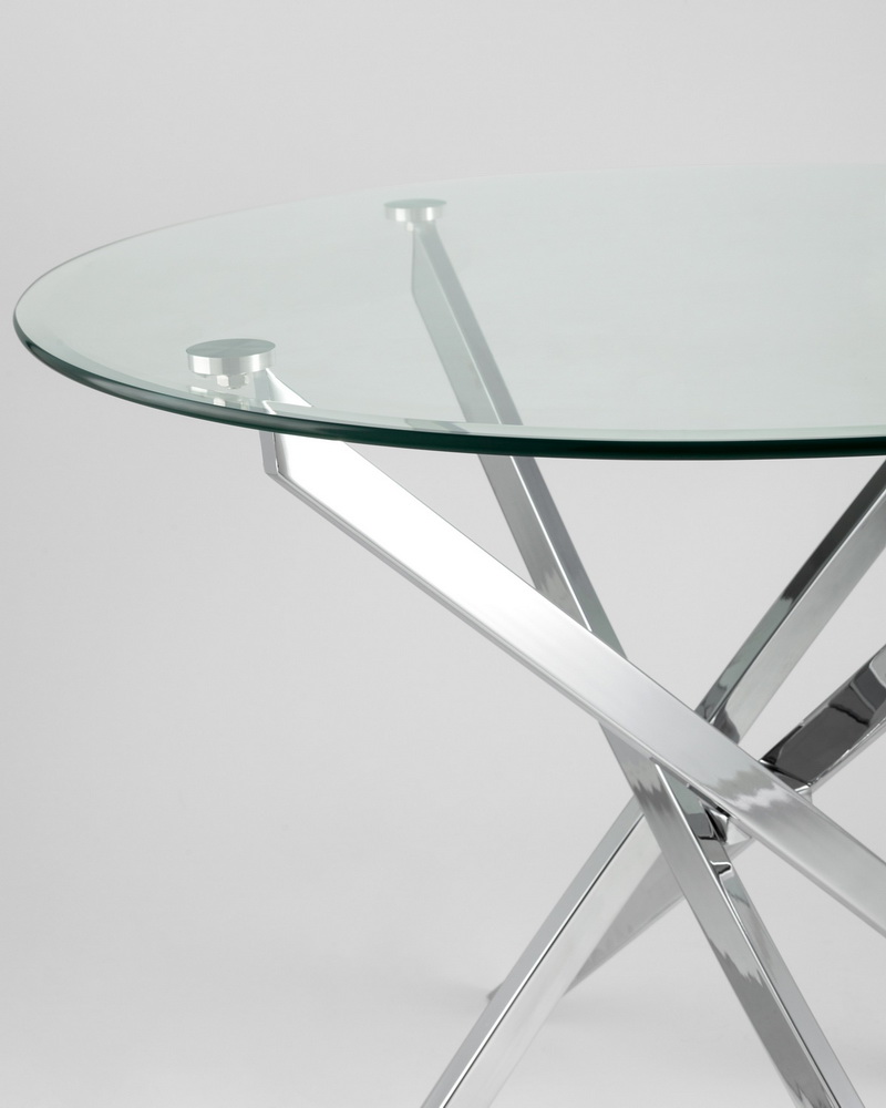 Стеклянный обеденный стол Ходро 90 с дизайнерскими оригинальными ножками из хромированного металла. Столешница выполнена из качественного закаленного стекла.