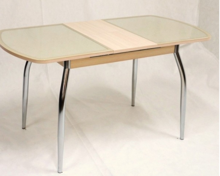 Раздвижной полуовальный стол. Столешница выполнена из ЛМДФ и декорированной экокожи с закаленным стеклом.