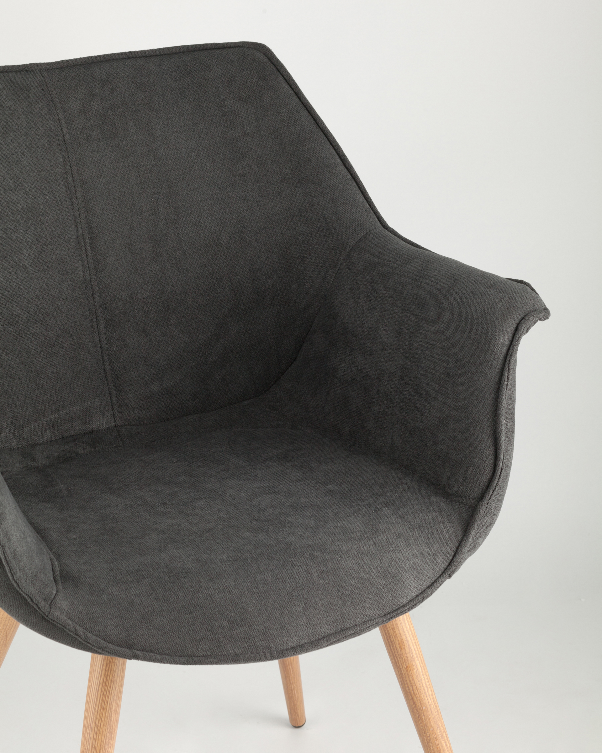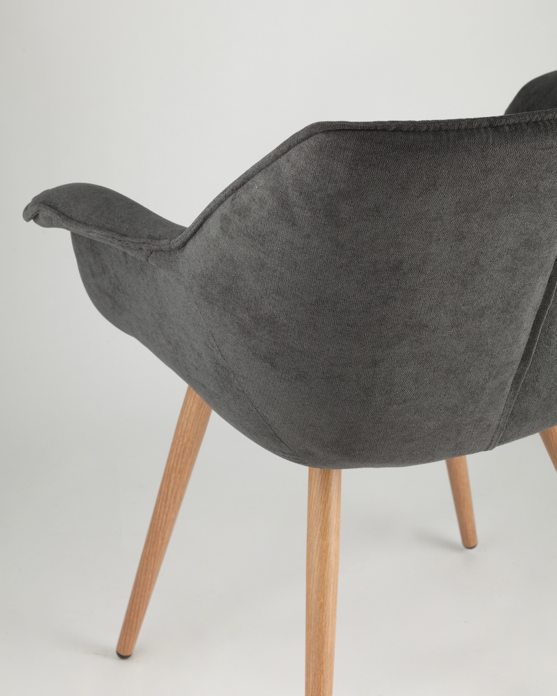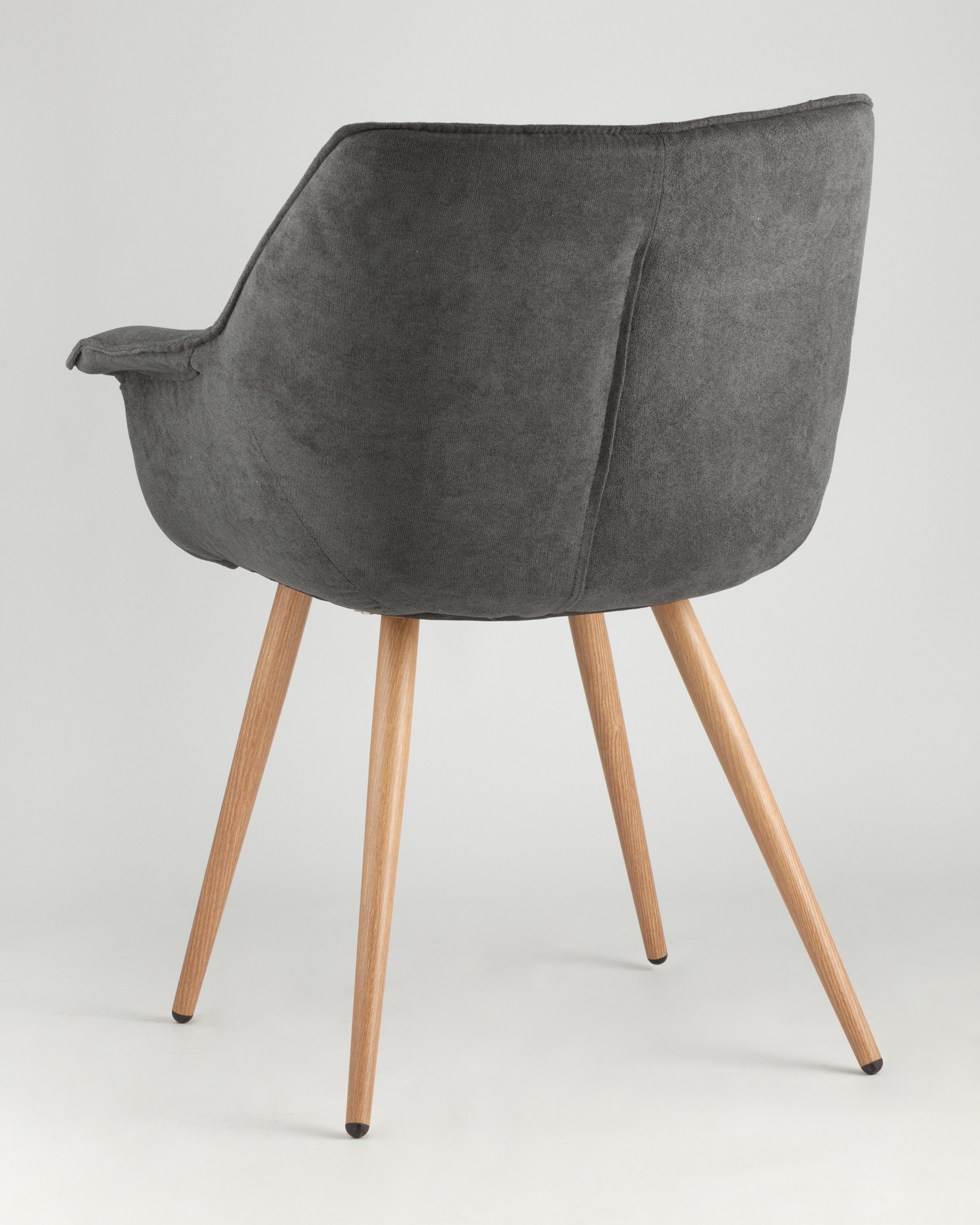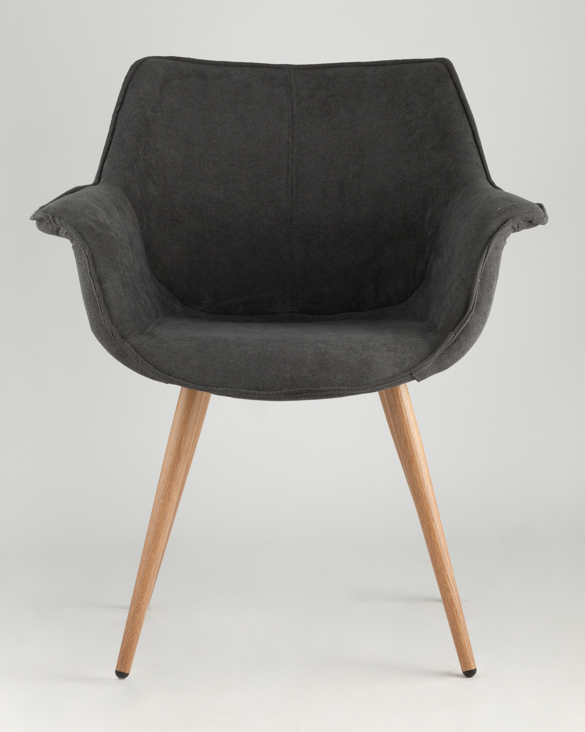 Стильный и мягкий стул имеет широкую эргономичную спинку и удобные подлокотники. Обивкой послужила высококачественная плотная ткань. Ножки стальные с принтом под дерево.
