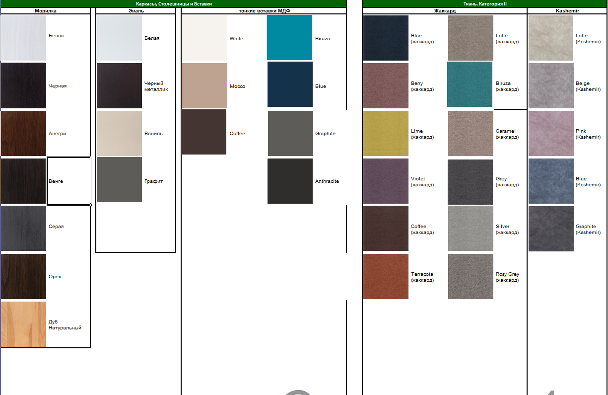 Каркас: массив березы, покрытие - морилка/эмаль;  Сидение: ДСП, покрытие - Жаккард/Kashemir,  Жесткое сидение - морилка/эмаль.