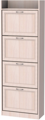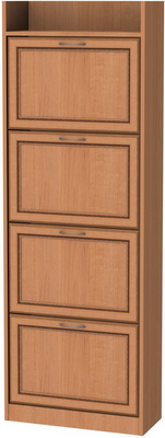 Данная модель оборудована четырьмя вместительными отделениями, куда может вместиться пару десятков комплектов обуви всей семьи. Она без проблем справится с задачей хранения и содержания в порядке и зимних, и летних пар, и даже более того – не займет много места в прихожей. Ведь даже большие прихожие нуждаются в рациональном размещении мебели. Эта высокая и неширокая тумба – именно то, что нужно. Каждое из отделений разделено на две секции, если Вы посмотрите на модель в раскрытом виде, то поймете, насколько она функциональна! Очень жаль, что зачастую этому важному элементу интерьера не придается необходимого значения. Установив дома такую тумбы, Вы обязательно оцените ее удобство. Но не только это отличает предлагаемую модель. Она станет еще и несомненным украшением Вашей прихожей. Поскольку внешнее оформление предполагает один из пяти возможных вариантов имитации ценных пород дерева, эта тумба обязательно привлечет к себе внимание Ваших гостей – она смотрится дорого и солидно. Оформлено изделие в классическом стиле, универсальном и подходящем к большинству вероятных дизайнерских решений в стилевом наполнении интерьера прихожей. Светлая и просторная прихожая предполагает светлую мебель – в таком случае молочный дуб – то, что Вам нужно. Темный благородный оттенок ясеня Шимо придаст элегантности и благородства. А в современный стиль, конечно, замечательно впишется оттенок венге.