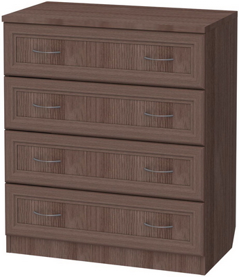 Комод оборудован четырьмя ящичками, дополненными выдвижным механизмом, в которых можно хранить различные вещи. Механизм движения состоит из прочных металлических и пластмассовых элементов, которые способны выдержать не одну сотню закрываний и открываний. Довольно часто такие комоды устанавливают в детских комнатах, поскольку в них очень удобно хранить одежду для детей. Ящички оснащены металлическими ручками удобной формы и дополнительным декоративным украшением в форме правильного четырехугольника, которое подчеркивает строгую красоту и изысканность этого предмета мебели. Внутреннее пространство выдвижных ящичков довольно большое, что позволяет хранить даже постельные принадлежности, благодаря чему комоды нередко располагают в спальных комнатах.