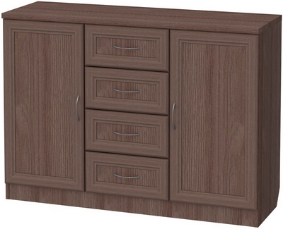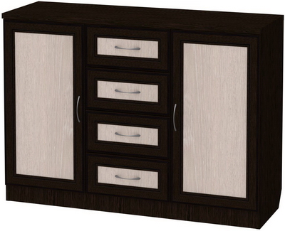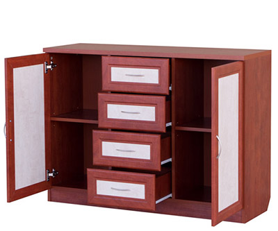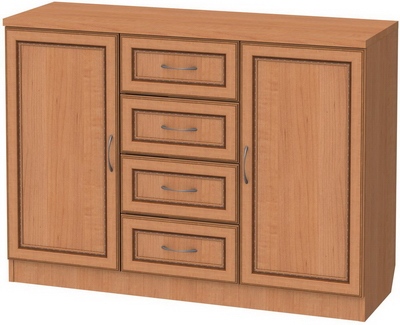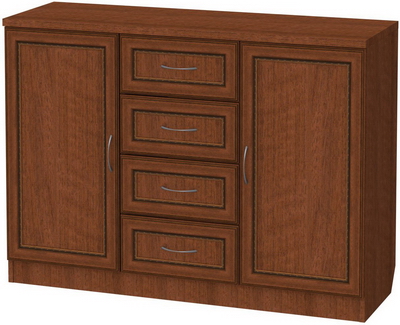 Четыре выдвижных ящика, размещенных в центральной части комода, укомплектованы ручками, расположенными по центру передней панели, а выдвижной механизм состоит из роликов, которые движутся по специальным направляющим. Благодаря этому можно с легкостью открыть или закрыть ящик, не опасаясь поломок. Обе боковые части оснащены дверьми, которые ограничивают доступ к внутреннему пространству, разделенному полочкой.